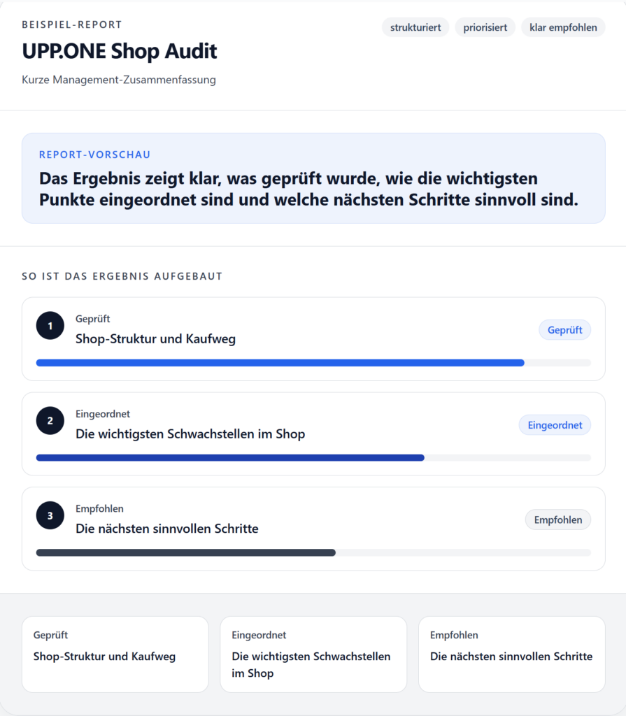 Sie sehen, welche Punkte in Ihrem Shop aktuell am meisten bremsen und was sinnvollerweise zuerst geprüft oder verbessert werden sollte.